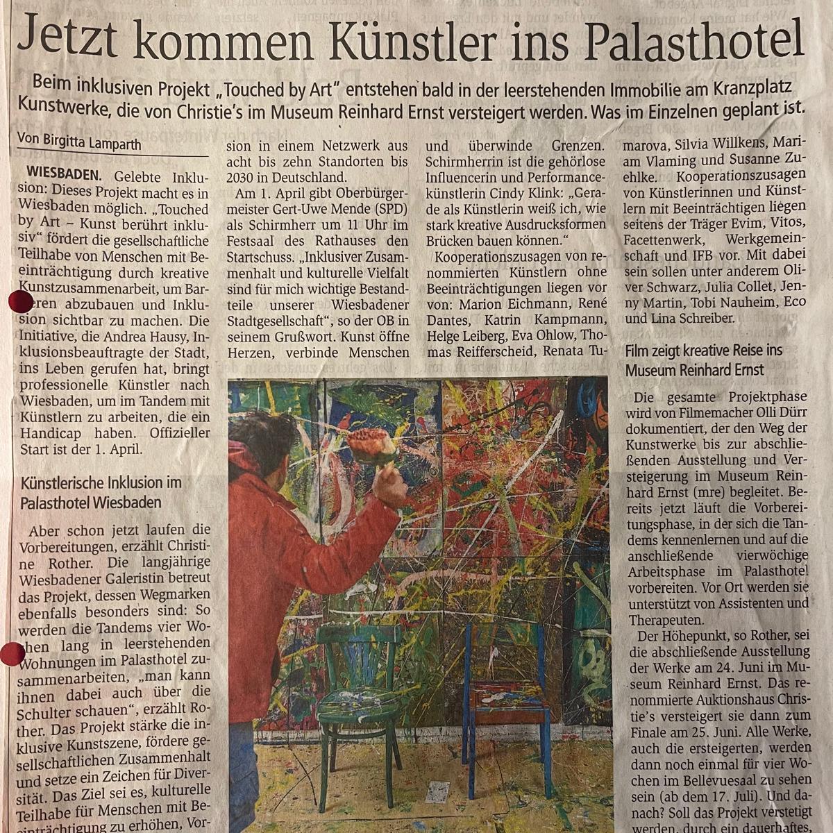Kunst kann Barrieren überwinden. Touched by Art – Kunst berührt inklusiv setzt diese Kraft ein. Regionale Künstlerinnen und Künstler mit Beeinträchtigung werden mit renommierten Kunstschaffenden aus ganz Deutschland zusammenzuarbeiten, die der Einladung des Projektteams nach Wiesbaden gefolgt sind.