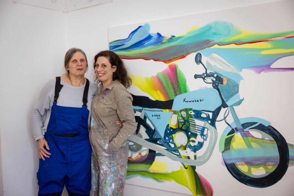 Eines der Tandems besteht aus der Berliner Künstlerin Katrin Kampmann, die an der UdK in Berlin bei Prof. K.H. Hoedicke studierte und der Wiesbadenerin Jenny Martin. Martin war leidenschaftliche Motorradfahrerin, verunglückte aber und zog sich schwere Kopfverletzungen zu, deren Folgen ihre kognitiven Fähigkeiten einschränken. Mit Kampmann brachte sie ihr Motorrad zurück auf die Leinwand – eine berührende Erinnerung und Verarbeitung der Autodidaktin. Kampmanns Arbeit ist geprägt von großer Offenheit und direkter Ausdruckskraft. „Wir begegnen uns auf Augenhöhe und ich habe sie an manchen Stellen getragen“, resümiert sie die bisherige Zusammenarbeit, in der unter anderem ein Werk entstanden ist, in dem sich der leichte und freie Stil Kampmanns mit der realistischen Darstellung von Martins Unfall-Kawasaki verbinden.