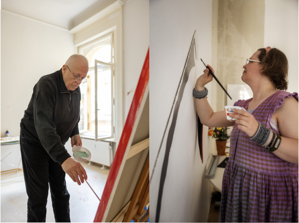 Die Kunstwerke, die in der Zeit entstanden sind, zeigen, wie vielfältig künstlerischer Austausch sein kann – von impulsiver Malerei über visuelle Klangräume bis hin zu neuen Formen der Wahrnehmung und Verständigung. In jedem Tandem arbeiten autodidaktisch und professionell Kunstschaffende zusammen.